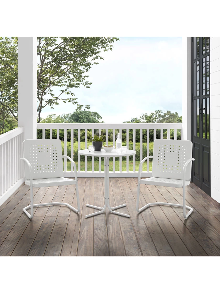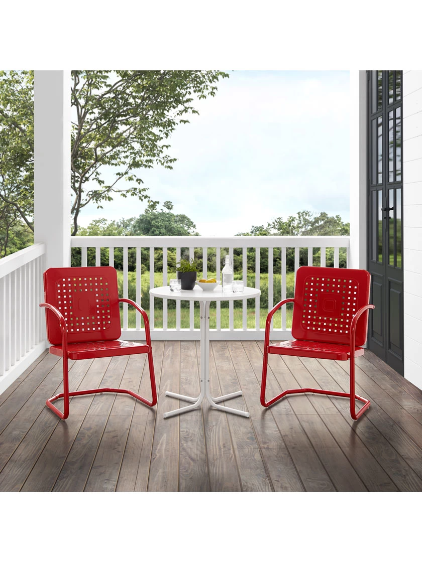 Nostalgia abounds with the Bates 3pc Bistro Set. Two vintage-style chairs in vibrant colors surround a simple metal bistro table for a fun and functional outdoor lounging experience. Each chair features a square back with a unique basket weave design that allows air to circulate. With a cantilever design, the chairs offer a comfortable seat for outdoor relaxation. The table’s sturdy pedestal base is comprised of four metal legs and easily tucks between the chairs, making the Bates 3pc Bistro Set ideal for a small balcony or patio.
