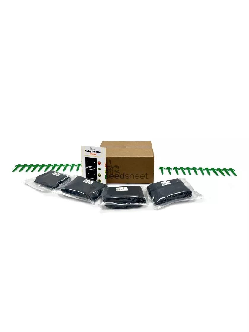The dissolvable seed pouches are made out of a food-safe polyvinyl alcohol film, most commonly used in gel casings for pills. The permeable weed-blocking fabric keeps weeds at bay without harmful chemicals, and allows for water and air exchange. While sheets arrive in set dimensions, you can easily cut to desired size (just be careful not to cut into seed pouches). Included stakes help to anchor each SeedSheet.